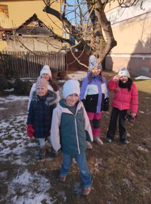 Zelená a modrá družina dnes potěšily ptáčky na školní zahradě vlastnoručně vyrobenými koulemi.