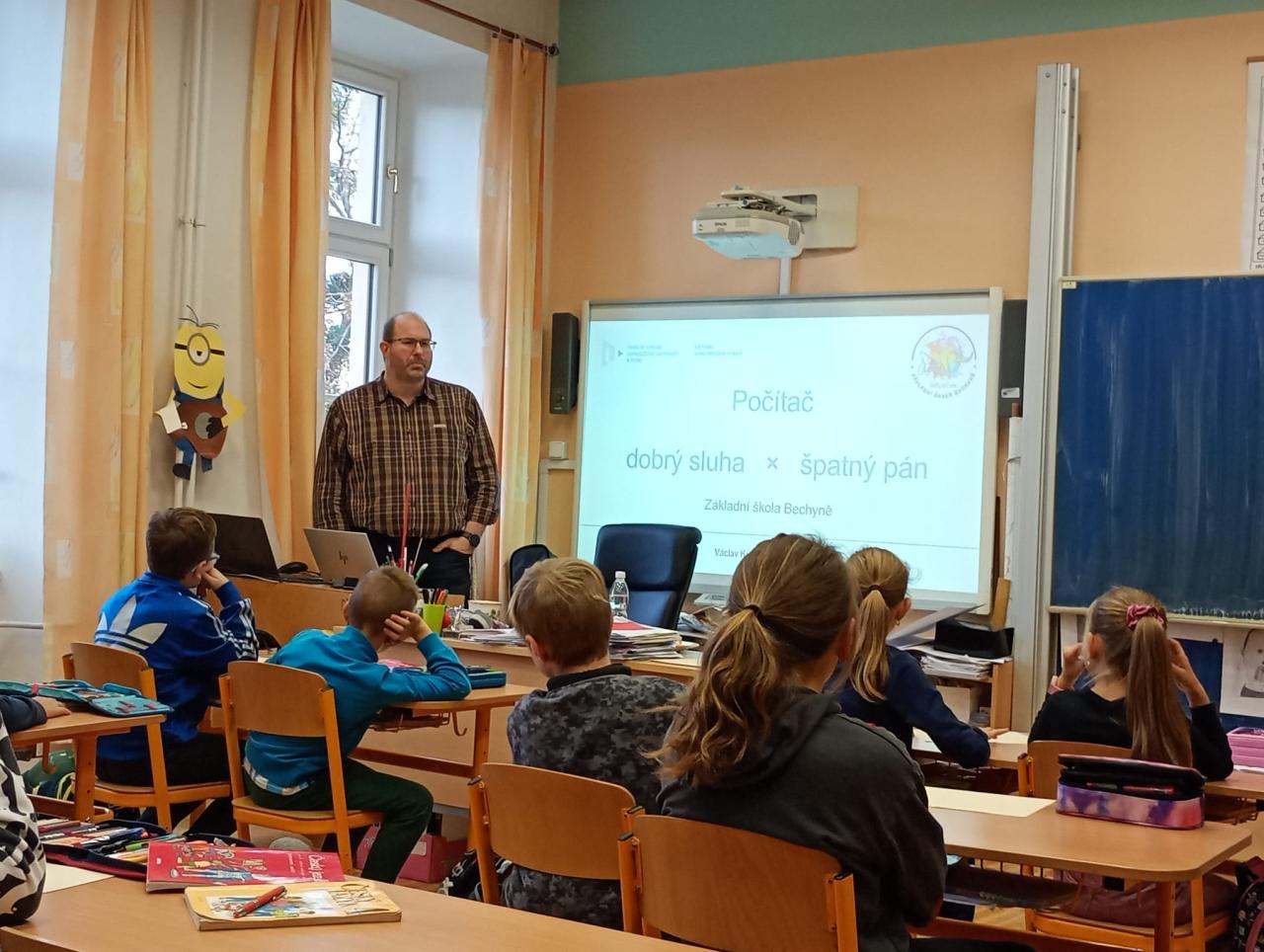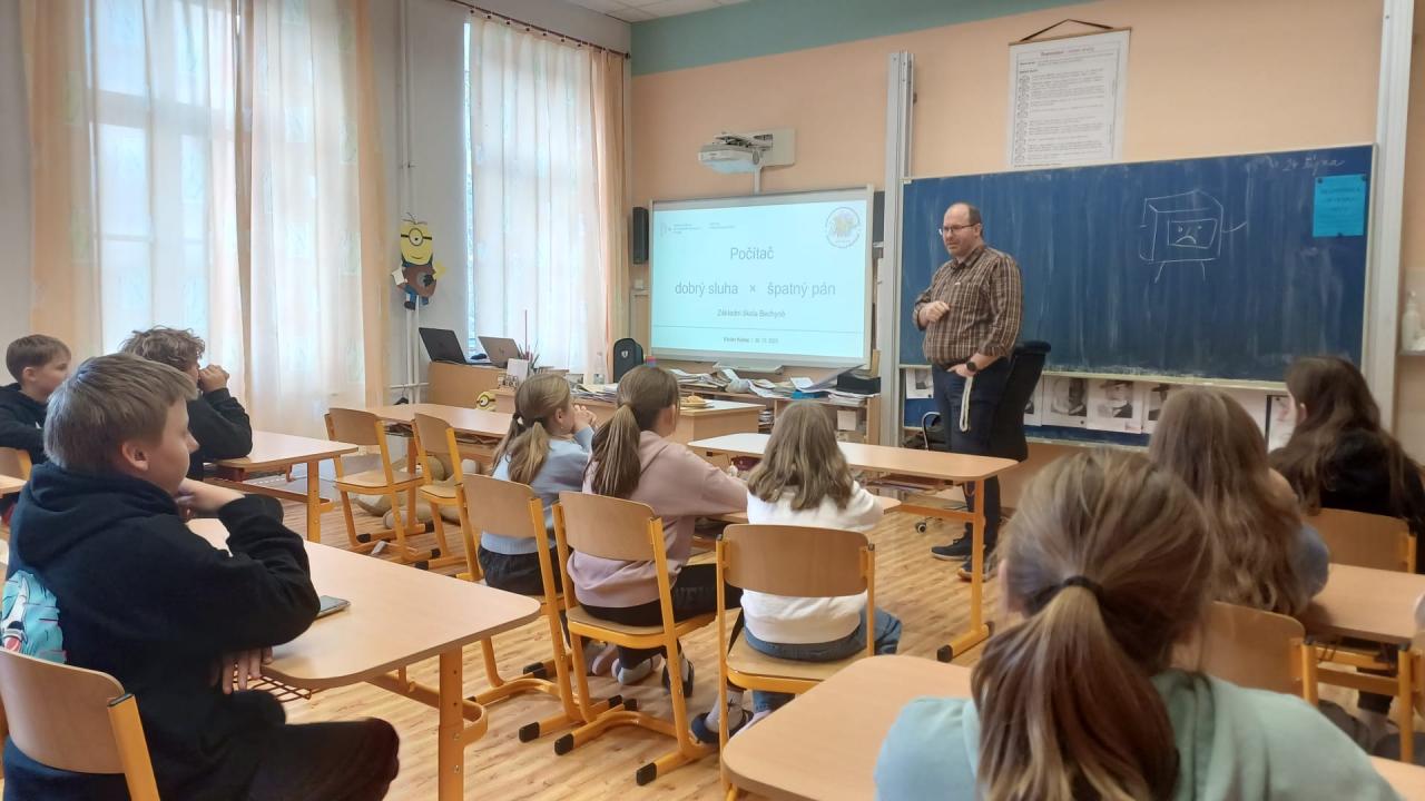 Ve čtvrtek 30. října 2025 se ve škole uskutečnila beseda pro 4.A a 5.A. Odborník z praxe, pan doc. Ing. Václav Kubec, PhD., ze Západočeské univerzity v Plzni, se podělil o své názory na téma "Počítač jako dobrý sluha, ale zlý pán". Diskuze se zaměřila na výhody a nevýhody používání počítačů v každodenním životě. Žáci měli možnost se ptát a dozvědět se, jak správně využívat technologie v jejich prospěch.