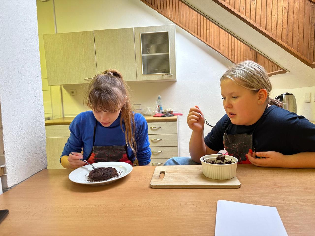 Během následujícího setkání klubu už to v kuchyni doslova žilo. Vyhrnuté rukávy, zavázané zástěry a nadšení do práce vytvořily skvělou atmosféru. Angličtina se rázem stala přirozenou součástí komunikace i samotného vaření. Výsledkem společného úsilí byly výtečné čokoládové lava cakes s tekutým středem a dokonale křupavé, přesto nadýchané vafle.