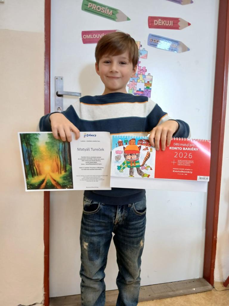 Matyáš Tureček, žák 2. A, byl oceněn za svůj výjimečný obrázek draka v projektu Malujeme pro Konto bariéry. Tento projekt má za cíl podpořit děti s handicapem a jejich rodiny. Matyášova kreativita a talent byly uznány a my mu srdečně gratulujeme. Jeho práce je inspirací pro ostatní žáky a ukazuje, jak můžeme pomocí umění vyjádřit naše myšlenky a pocity.