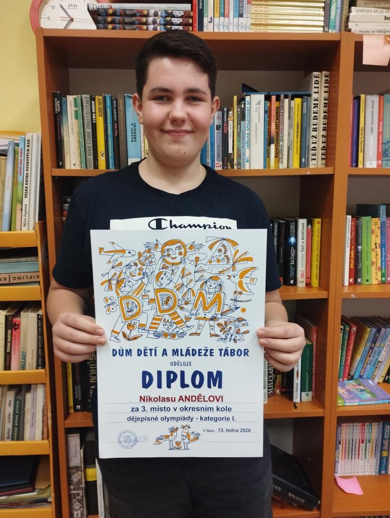 V úterý 13. ledna se v Táboře konalo okresní kolo dějepisné olympiády kategorie I., letos s tématem „Dvě strany téhož příběhu: Jak muž a žena kráčeli dějinami – spolu, proti sobě i vedle sebe.“ Naši školu zde reprezentoval Nikolas Anděl z 9. A. Nikolas prokázal výborné znalosti i schopnost vidět historické události z různých perspektiv. Díky pečlivé přípravě a zájmu o historii se mu podařilo vybojovat v silné konkurenci výborné 3. místo. Gratulujeme k úspěchu a děkujeme za skvělou reprezentaci školy!