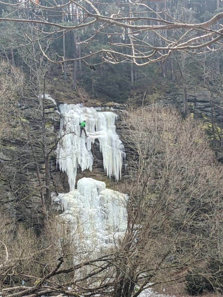 Tam se chystaly objevit ledopád na druhém břehu. Naštěstí sluníčko ještě ledovou krásu neroztálo. Cestou jsme si zopakovali skupenství vody, vyjmenovaná slova a sledovali horolezce na ledové stěně.